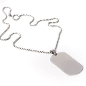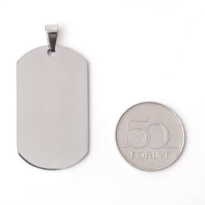 Orvosi acélból készült, fényes, kerekített végű téglalap / katonai dögcédula alakú medál hozzá tartozó akasztóval , ezüst színben amely valódi ezüst hatását kelti.