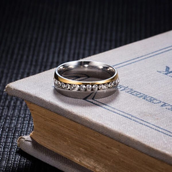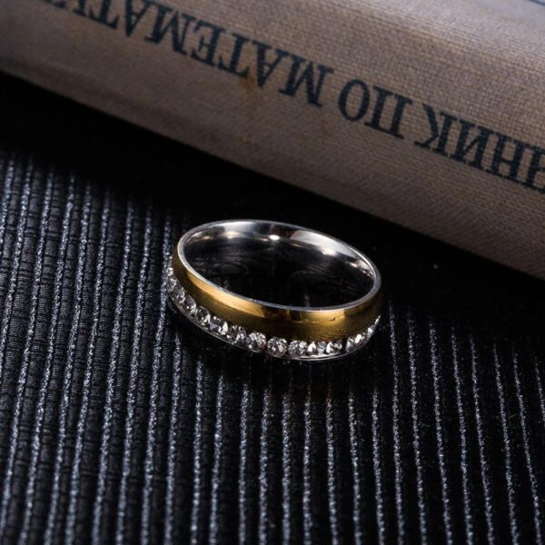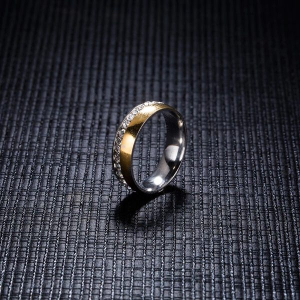 Zselyke nemesacél gyűrű arany-fehérarany fazonban strasszkővel gazdagon díszítve.